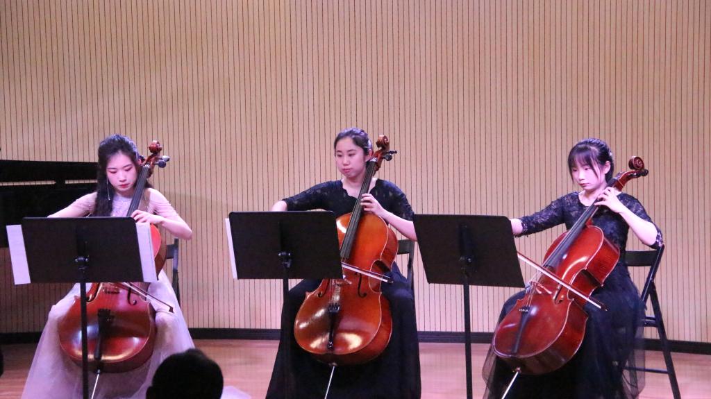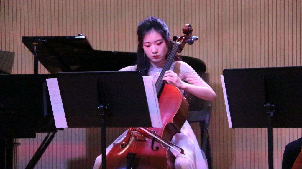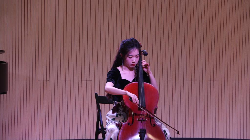 音乐会在世界名曲《C大调第一大提琴协奏曲》中拉开了帷幕,紧接着贺佳琪又拉奏了几首外国名曲,音乐会进行到下半场,由一首蒙古族民曲《鸿雁》,把音乐会推入了高潮,从大提琴独奏曲目《鸿雁》中,感受到草原的辽阔,琴声之美妙。最后,在毕业音乐会结束后,贺佳琪发言,说到自己非常感谢自己的导师——郑文英老师,谈起和郑文英老师学习的点点滴滴,贺佳琪感慨到:“在大提琴的学习中,我的导师对我的影响非常大,不光是在音乐学习方面,更在做人方面给我不断的教诲,这是我人生中最宝贵的财富。”
