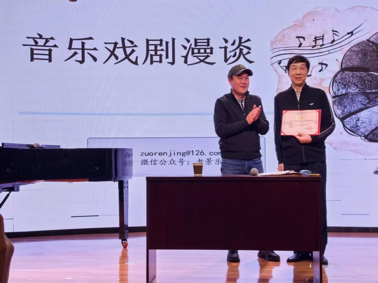 本网讯 (文/赵若希 图/黄莉 审核/吴映春)2025年11月13日下午14:30—16:30,由乐山师范学院音乐学院主办的“科研启航”学术讲座《音乐戏剧漫谈》在音乐学院邦泰学术报告厅顺利举行。著名音乐评论家、音乐学家景作人教授担任主讲,音乐学院师生齐聚一堂,共赴这场音乐戏剧的学术盛宴。讲座开始前,音乐学院院长周特古斯为景作人教授颁发客座教授证书。 景作人教授,中央歌剧院交响乐团中提琴演奏家、国家一级演奏员、中国音乐家协会会员、中国音乐剧协会理事、文化和旅游部专家、国家艺术基金评审,西安音乐学院、四川音乐学院等多所高校任客座教授或研究员。他深耕音乐领域数十年,在《音乐爱好者》《音乐探索》等权威报刊发表音乐评论、理论文章上千篇,著有《音乐欣赏普及大全》《乘着乐韵的翅膀——景作人乐评集》等多部极具影响力的著作,学术成果与实践经验并重,是音乐戏剧领域的权威标杆。