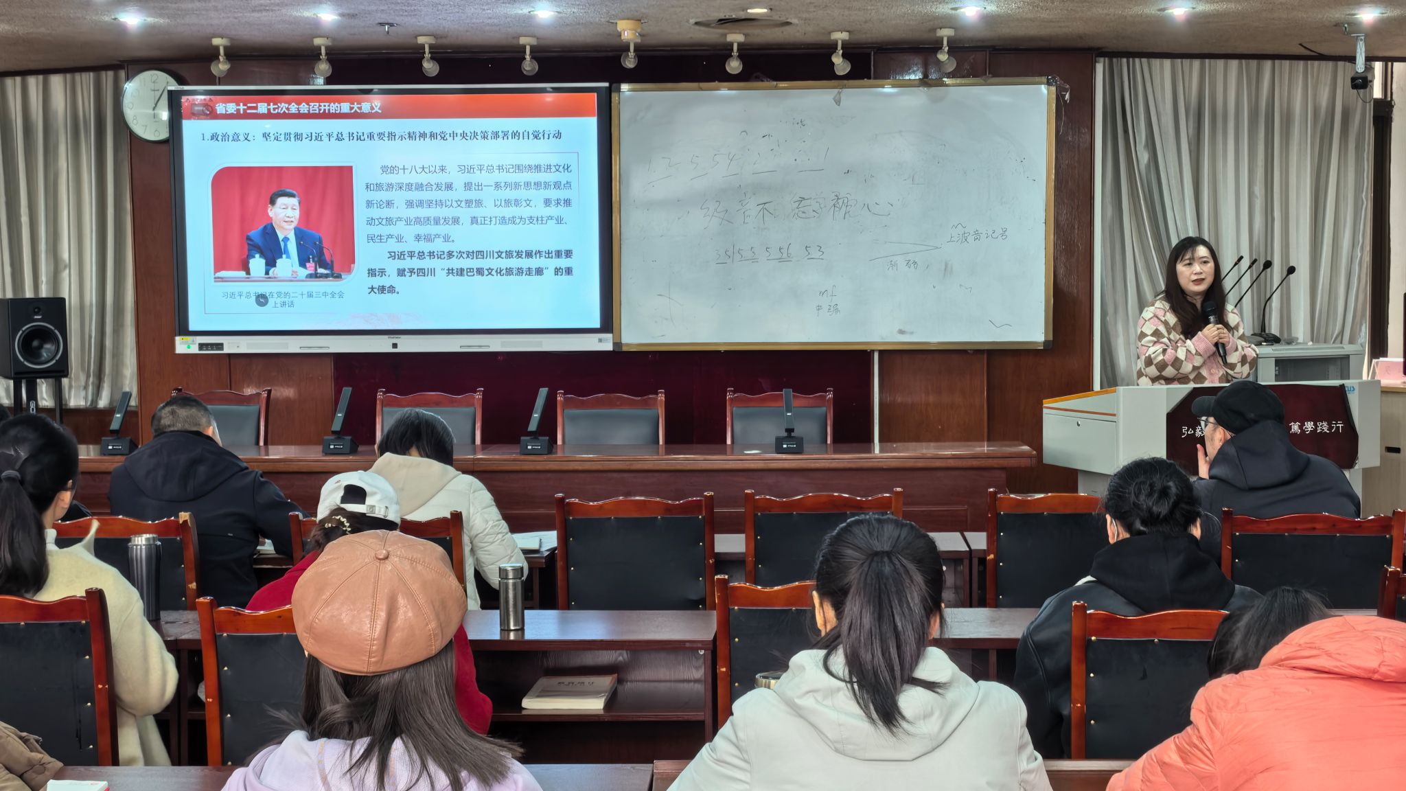 马克思主义学院杨红老师传达了中国共产党四川省第十二届委员会第七次全体会议。她从省委十二届七次全会召开的重大意义、推进文化和旅游融合发展的战略部署等方面详细讲解。