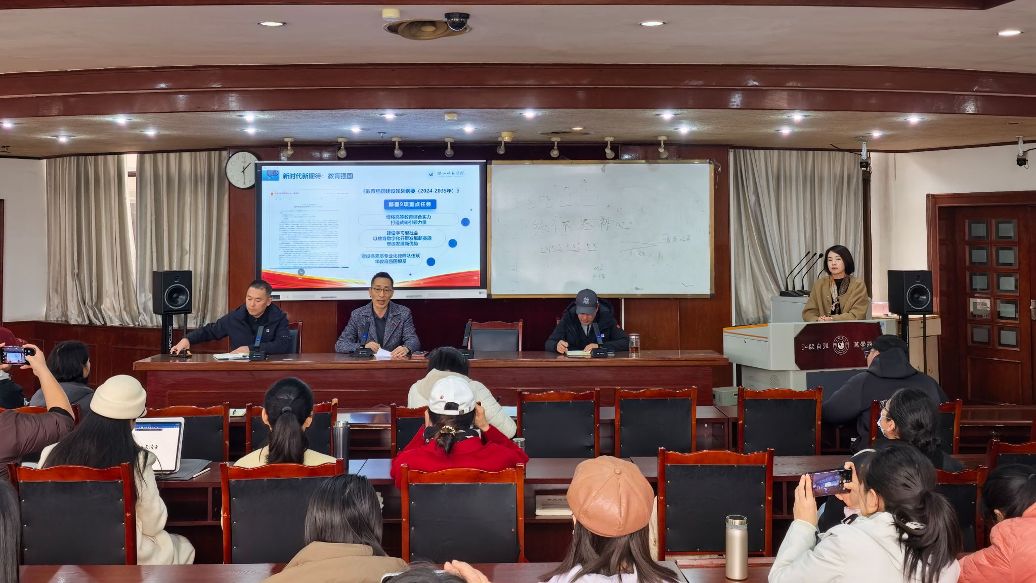 本网讯(文/郭元红 图/郭元红、毛敏)为进一步推动音乐学院师资队伍高质量发展,加强教师队伍思想政治建设,11月13日,音乐学院召开全体教职工大会,围绕思政教育和人事培训主题开展专题教育。学院党政领导班子及全体教职工参会。