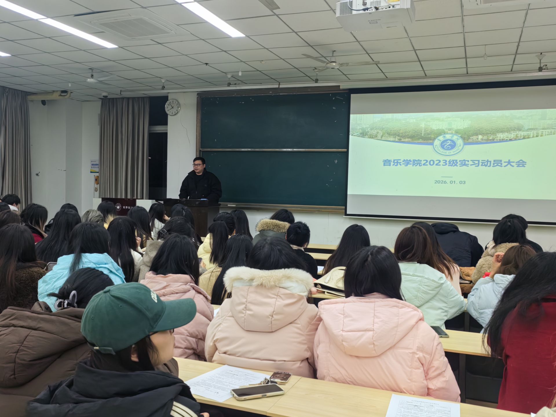 本网讯(文图/周琼怡)1月3日,音乐学院2023级学生实习动员大会于行知楼101教室顺利召开。音乐学院副院长吴映春、教学法教师王菊以及2023级全体学生参加了此次会议,会议旨在引导即将踏上实习岗位的学生明确目标、重视实习安全等,确保实习工作安全有序开展,会议由学生科长周琼怡主持。