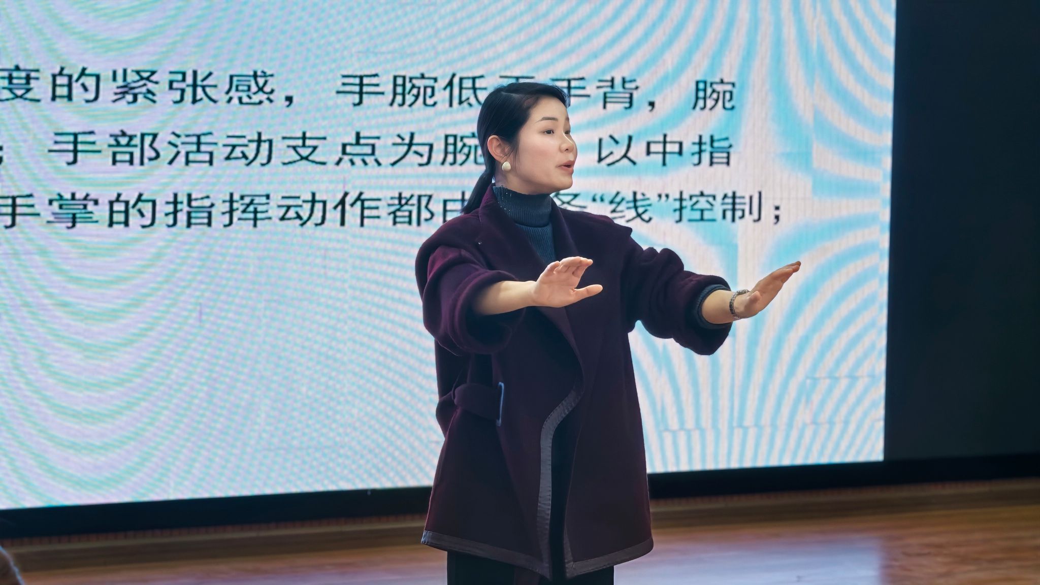 杨嵋从合唱理论与指挥法两方面开展培训。在理论环节,她从合唱的声部构成、团队协作等方面,层层剖析,细致入微地为教师们构建起完整的合唱知识体系。实践环节中,杨嵋聚焦指挥法,从基本拍入手,通过示范详细讲解力度、速度和表情的变化。为了让教师们更好地掌握,她还结合《草原上升起不落的太阳》《四季的问候》等合唱曲目,组织大家进行曲目指挥训练。培训现场,老师们学习热情高涨,积极投入,纷纷上台实践。